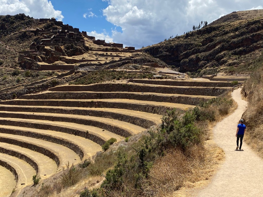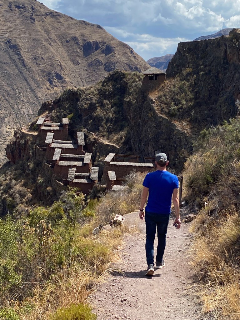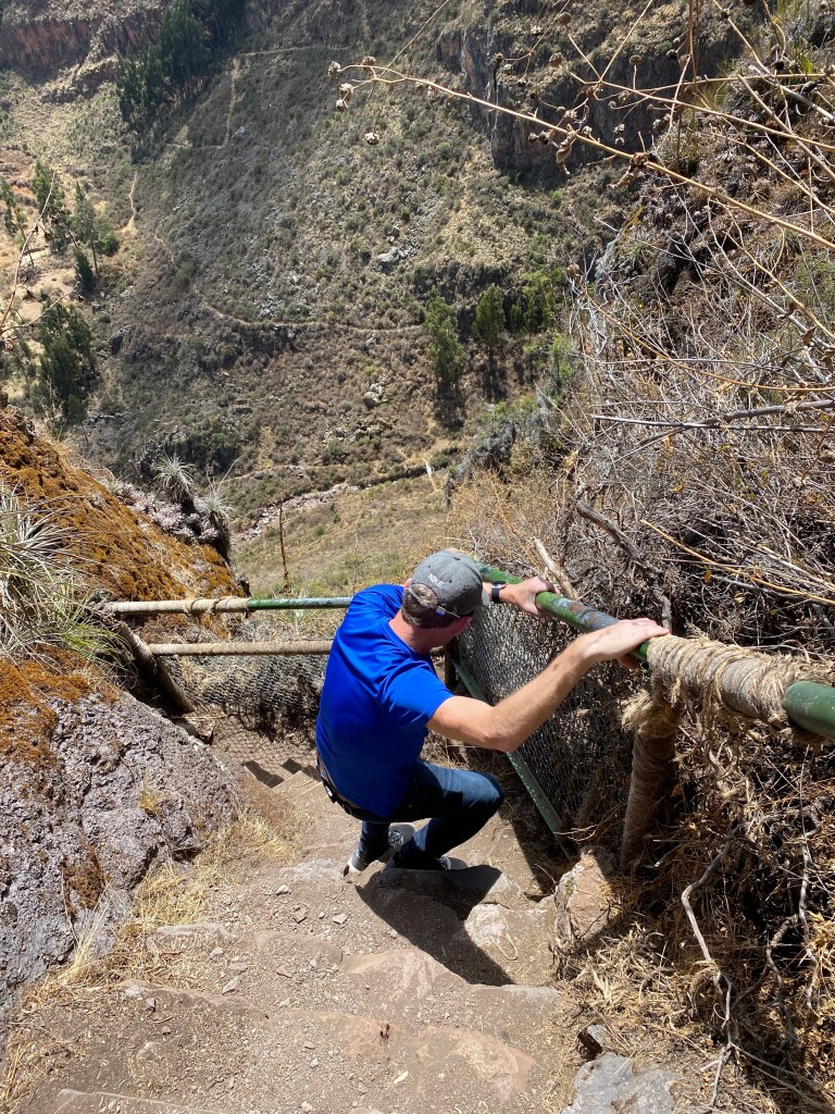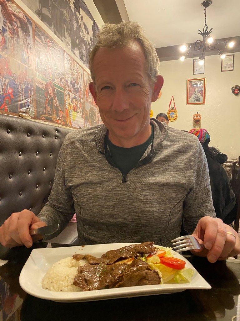 A day later, the pills were definitely helping and so we set off to do a DIY trip to Pisac in the Sacred Valley. We found a local bus (collectivo) and really enjoyed the drive through the countryside. The little town was so pretty and we enjoyed a drink in a square watching people who had decided to hike up to the ruins. We’d read that this was 3 hours uphill (from 2972m to 3525m) and so decided we’d rather pay 25 soles (about £6) for the tuktuk and, boy, were we happy that we did. The collectivo dropped us where we had a 30 min uphill walk to the entrance and that was enough for us. The ruins were really interesting but there was not one information board there which was so frustrating as we had no idea what we were seeing. The view and terraces were quite stunning though and we did really enjoy it. We walked down to Pisac (90 mins) and met many people walking up puffing well and looking like they would have preferred a tuktuk too. We ventured into the market, which was “tat” central, and then ventured back out for a lovely meal. Callum is loving the menu of the day; 3 courses plus a drink for £6 with a choice of about 4 options for the 3 courses including an alpaca steak all in a sweet little restaurant. Everything we’ve eaten has been amazing though you always seem to get chips with your rice in the main meal- carb central with the churros too!