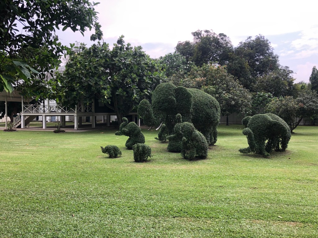 We also went to Bang Pa In Palace which is a few stops down the train line (7p journey!) . It is the place the story of the King and I is based at. Again, we were helped by some friendly locals who prevented us getting off at the wrong stop with much waving and pointing and we enjoyed a few hours wandering round the gardens. We were the only tourists in the whole place and the guards stood to attention as we wandered past which was both off putting and amusing at the same time. The dress code was very strict here so I had to wander round not in the shawl I had taken to cover my shoulders but in Callum’s Heineken T-shirt which did bring a smile to the security guards otherwise stern face! It was quite strange to see such western building designs in amongst the very few Thai buildings but this King was trying to show the west that he was modern and progressive. The gardens and museum that was full of gifts given to the King were pretty amazing and the topiary an added bonus.