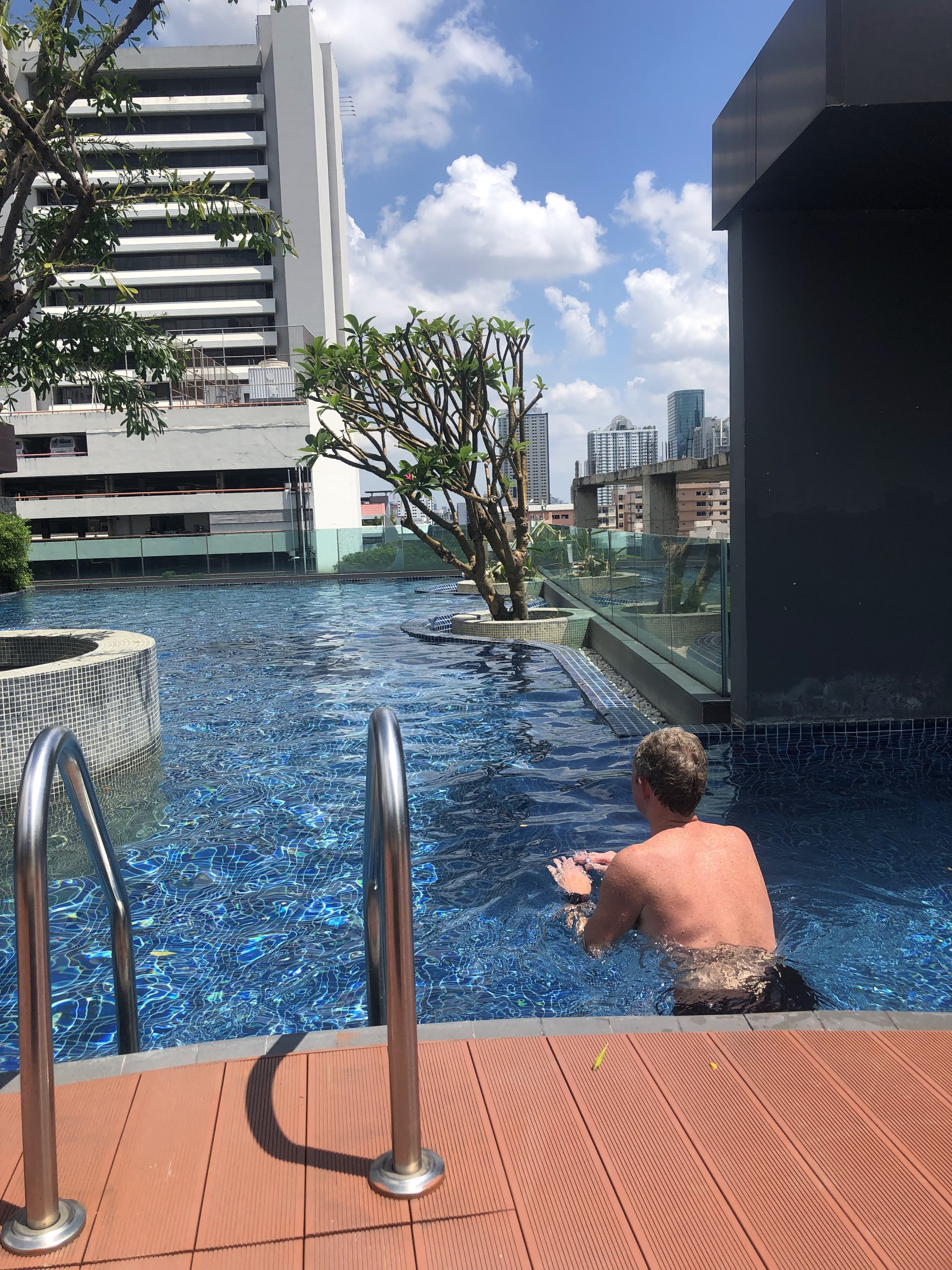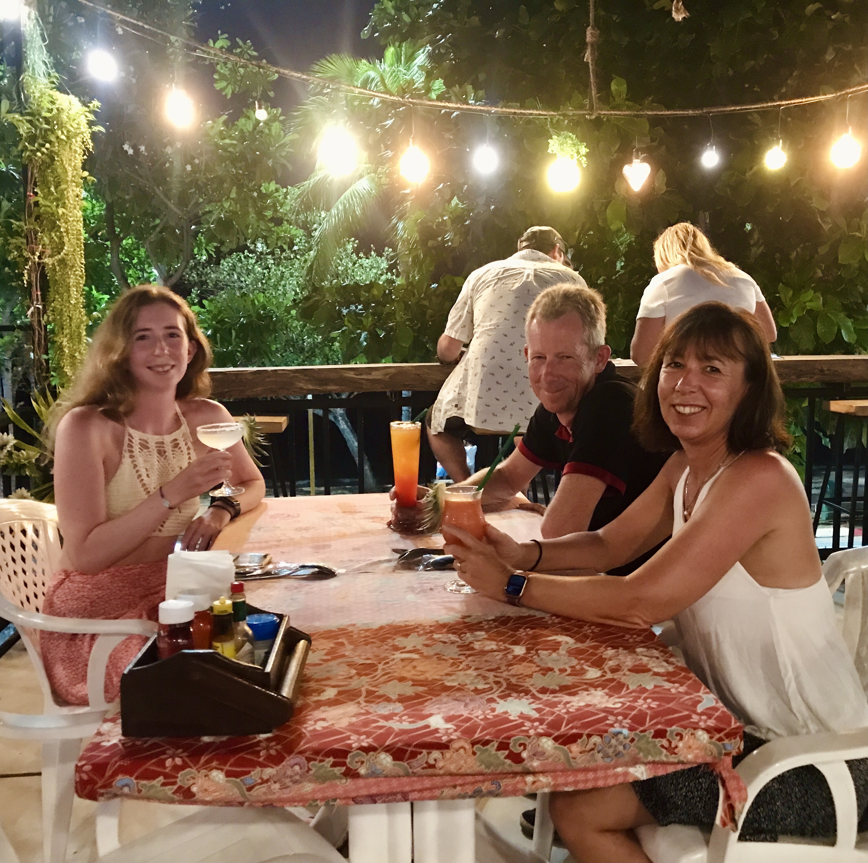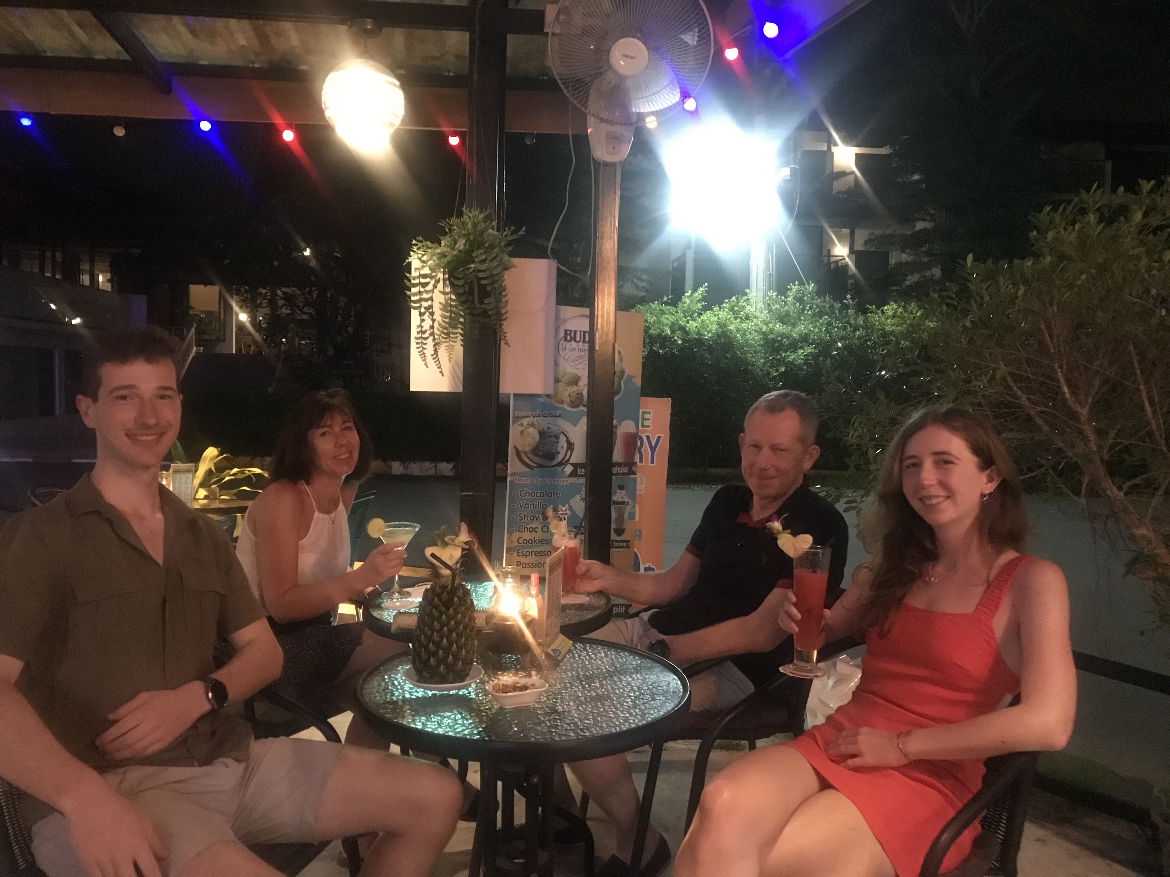 After a brief panic in Doha with 2 staff counting on their fingers the hours since our pcr test, our next flight to Phuket was full but, on landing, we were through the airport with the numerous tests and more invasive jabbing really quickly. We waved to Kate across the corridor and then holed up in our room for 5 hours awaiting test results in a thunderstorm. This was followed by a huge hug and cocktails.