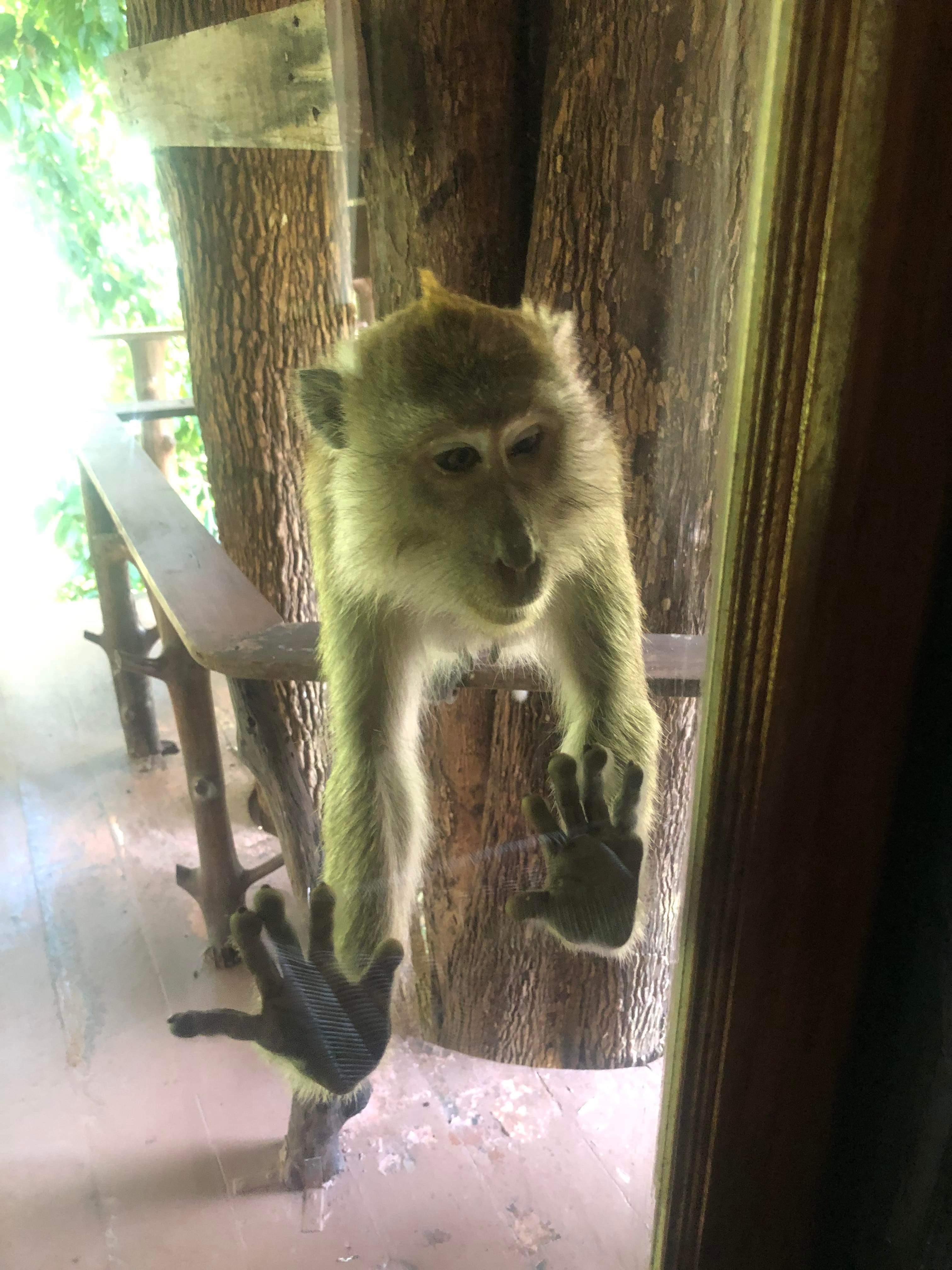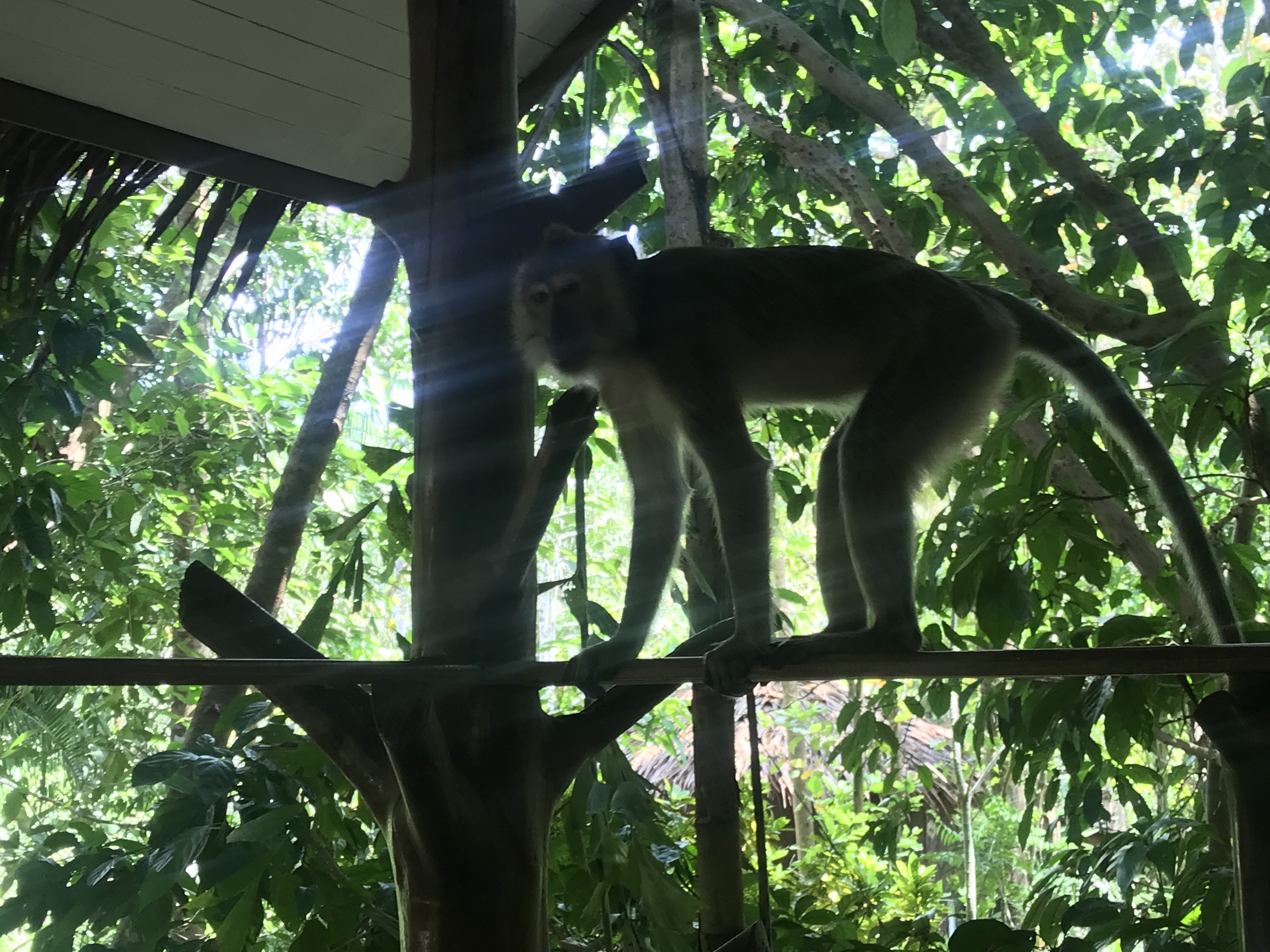 First he sat watching us and then got pretty persistent about coming very close. With the nurses advice when we had our rabies shots ringing in our ears, we beat a hasty retreat inside as soon as he hissed at us( who knew a long tailed macaque could hiss?) He was pretty insistent that he wanted into the treehouse, pushing the door and pacing up and down as if he owned the place! Callum, of course, had to wind him up through the window but after a few more hisses he gave up which was lucky as we had to go out on our canoe trip.
