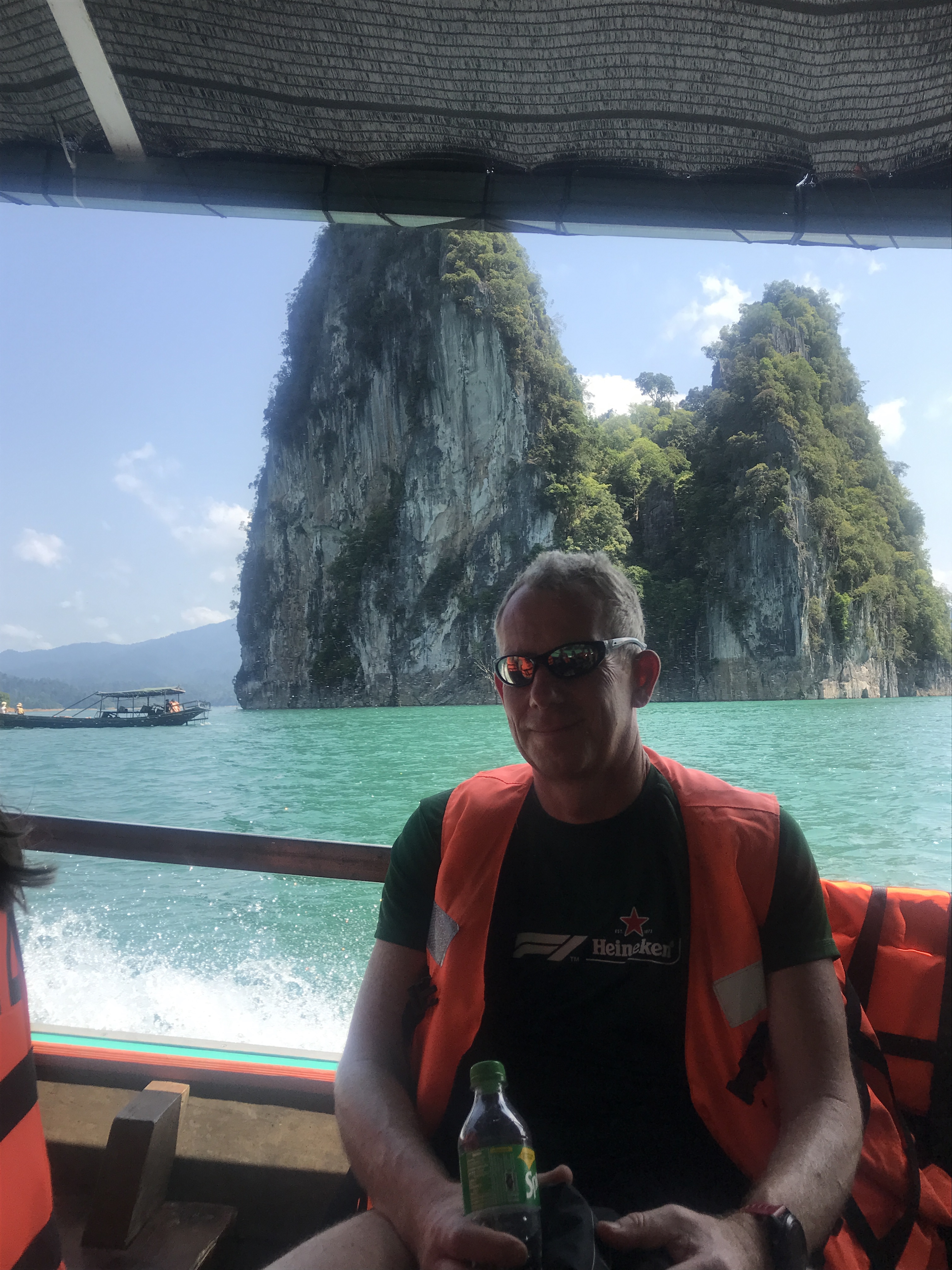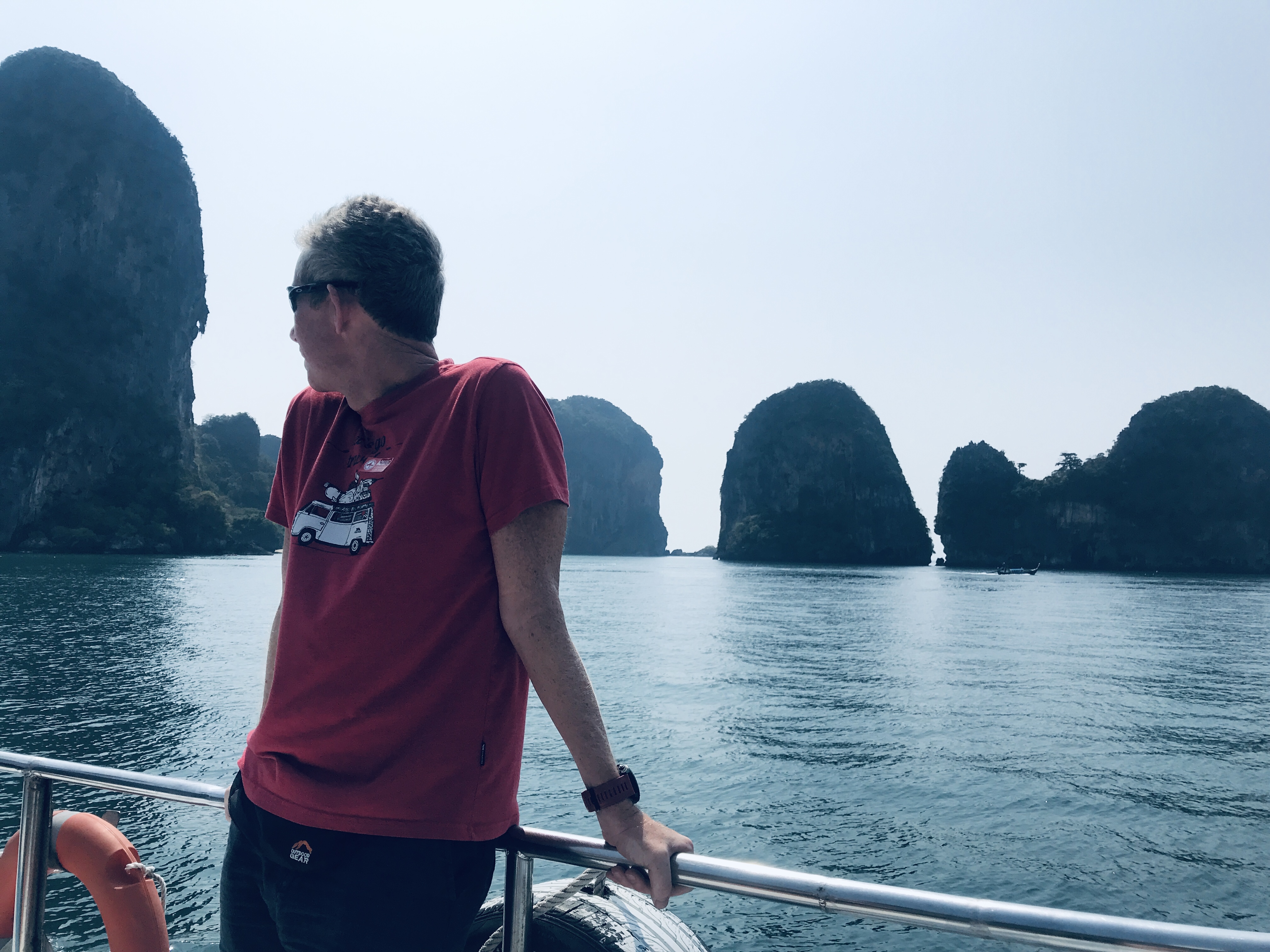 After our “poorly spell” we donned our back packs and set off to meet Kate in Krabi where she had been roughing it in a nice hotel waiting for us. The transportation here always amazes us by its ease, efficiency and low cost. We were picked up from the hotel, taken to the port on the opposite side of the island, shepherded and stickered (presumably to make the herding of foreigners easier) by staff onto a boat and then herded onto another van to be driven to our hotel. The journey cost £8 each and took 4 hours! The speedboat trip was something we would have paid for just the views.