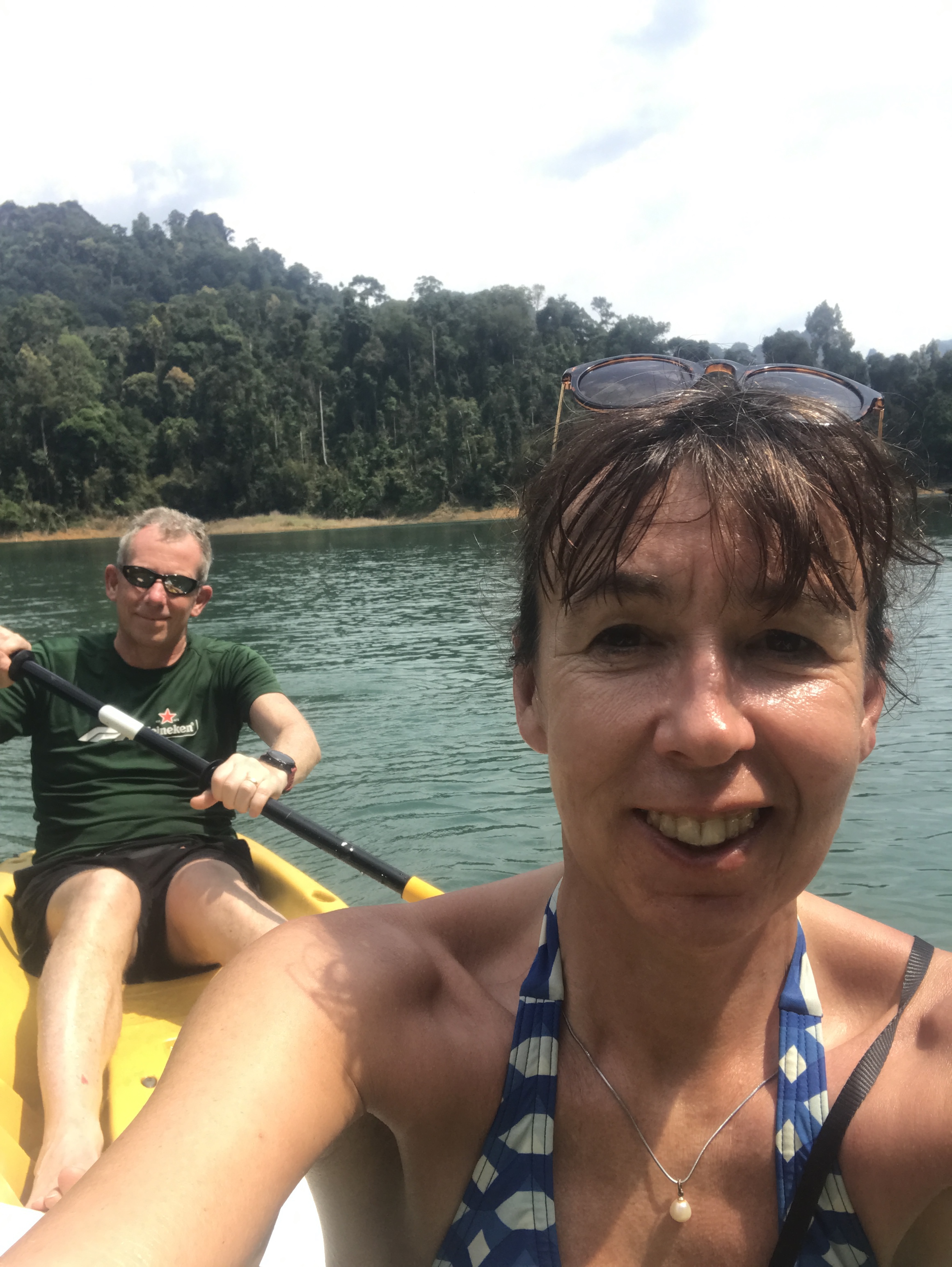 The following day we went on a day trip to Cheow Lan Lake which had been formed when the Thai government created a dam to generate power for the south of Thailand. We did actually get to canoe this time, as well as go on the speedboat, a raft, a trek through the rainforest with the guide and in a cave with lots of stalagmites and stalactites. We saw some horn bills, a wild boar, monkeys and a tarantula spider trap door. We were on the lookout for leeches but only saw the very bloody outcome of one on the only man in long trousers! He was not impressed. A great day despite being the oldest by 20 years- we were proud to be at the front of the pack on the trek though quite a few young ones didn’t even do it! The Scottish contingent couldn’t believe the waste of money!