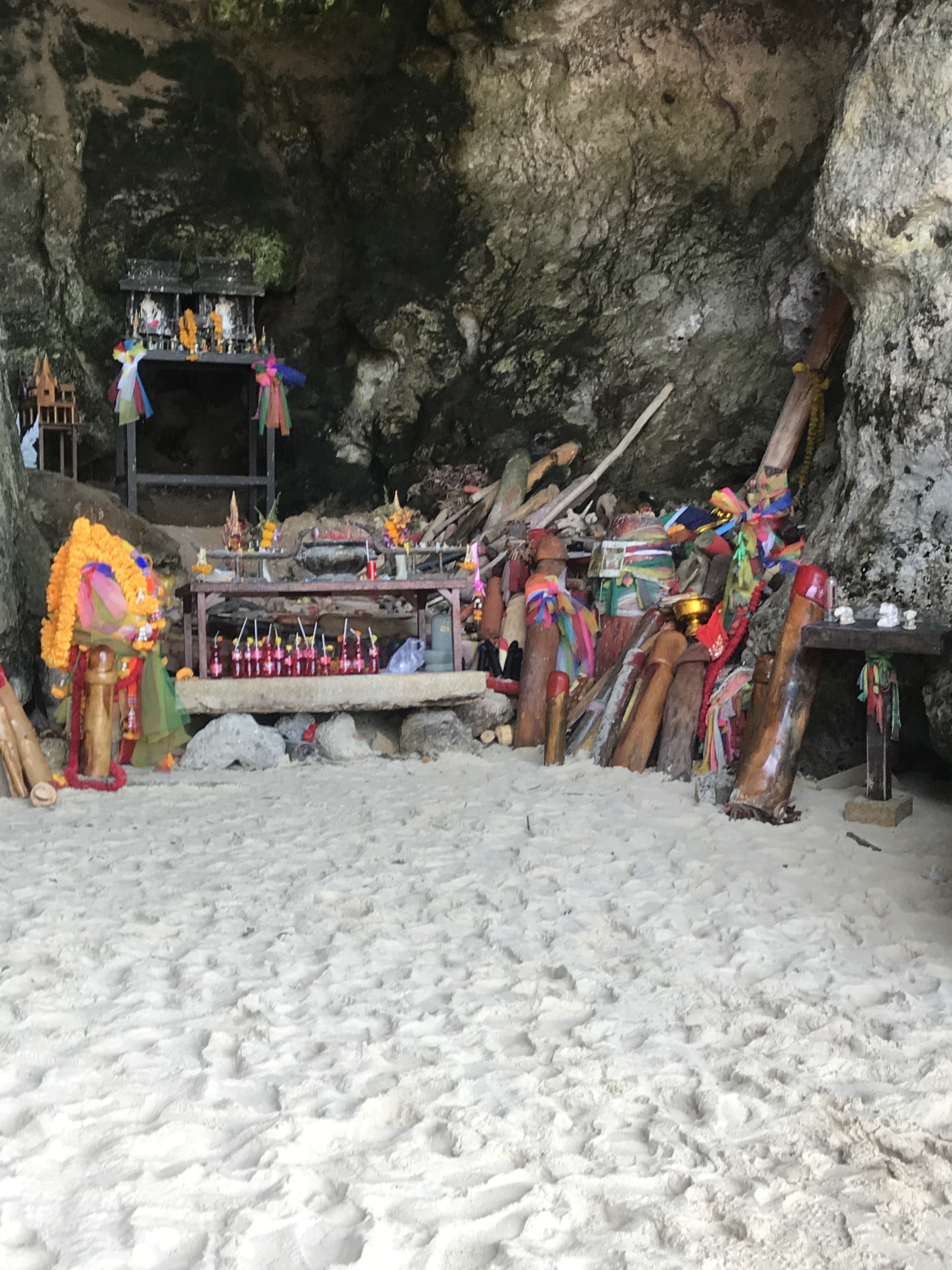 On our final day in Krabi, we decided a beach day was necessary so we got on a longtail boat and in a few minutes we were at Railay beach. It was quite idyllic. Kate sat in the shade to work though was dogged by sand and tech issues as well as mischievous monkeys trying to steal things. There is also a temple there with some rather interesting offerings. They were put there as fertility offerings so Kate (and you – if you’d been here Em) was ushered away rather quickly – we’re far too young to be grandparents!